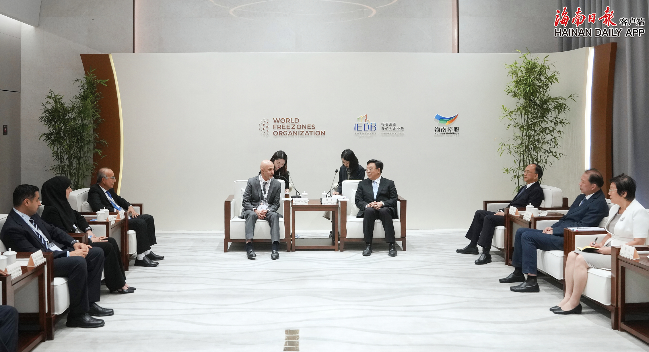 10月10日,第十一届世界自由区组织大会开幕后,省委书记冯飞在海口会见世界自由区组织主席穆罕默德·阿扎鲁尼一行。